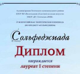 25 апреля подведены итоги VI Всероссийской теоретической олимпиады «Сольфеджиада» для учащихся детских школ искусств. Участники Олимпиады выполнили сложные и интересные теоретические задания, а также написали мелодический, интервальный и аккордовый диктанты. Учредители олимпиады: Администрация Тотемского муниципального района Учебно-методический центр по художественному образованию БПОУ ВО «Вологодский областной колледж искусств». Восемнадцать учащихся МАОУДОД […]