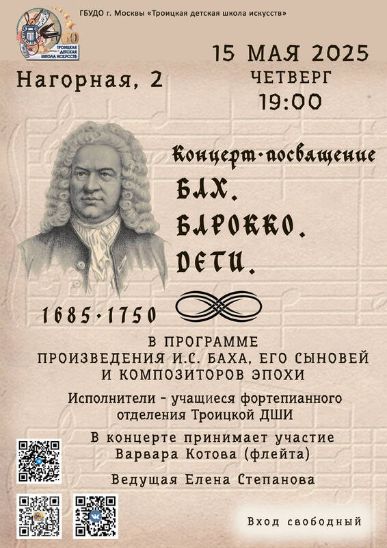 Концерт-посвящение И.С. Баху12 Май, 2025 в События Приглашаем на концерт-посвящение И.С.Баху, юбилей которого отмечается в этом году. Играют учащиеся фортепианного отдела школы.