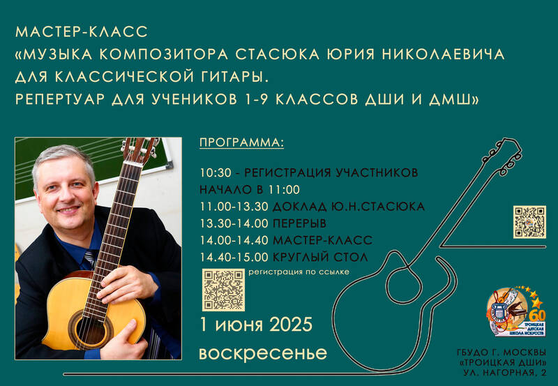 Приглашаем на мастер-класс преподавателя гитары ГБУДО г. Москвы «Троицкая детская школа искусств» Стасюка Юрия Николаевича. «Музыка композитора Стасюка Юрия Николаевича для классической гитары. Репертуар для учеников 1-9 классов ДШИ и ДМШ».