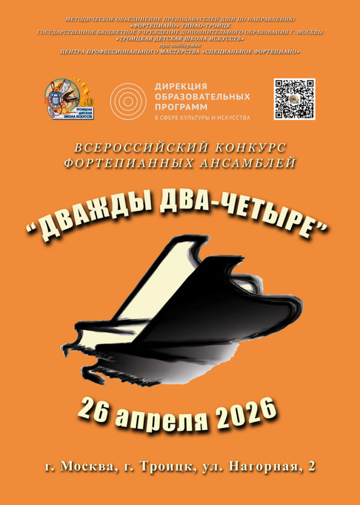 Всероссийский конкурс фортепианных ансамблей «Дважды два — четыре»22 Апр, 2026 в События Приглашаем на открытые прослушивания Всероссийского конкурса фортепианных ансамблей «Дважды два — четыре» Начало в 10:00 Страничка конкурса на сайте